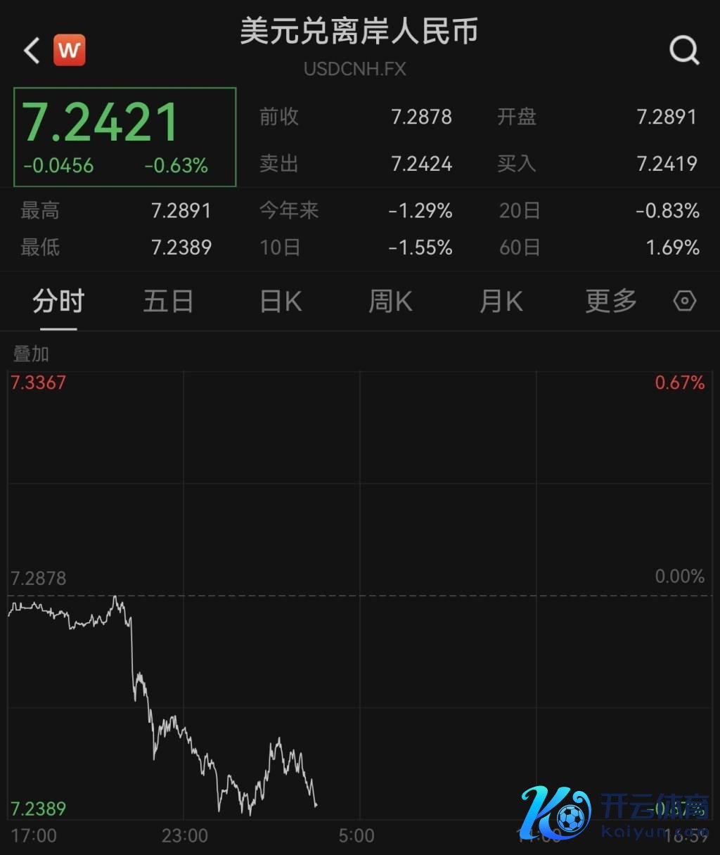 1月24日,离岸东谈主民币对好意思元汇率接连升破7.28、7.27、7.26、7.25和7.24关隘,法令发稿,最高升至7.2389,较前一往将来收盘价飞腾近500点。