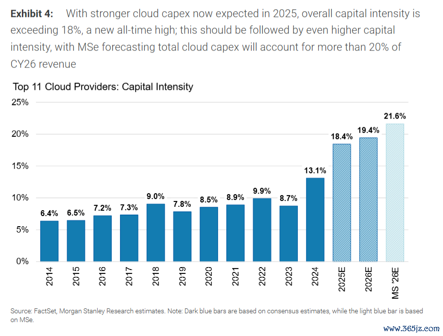 大摩瞻望,到2026年,这些公司的老本开支占收入的比例将进取20%,不息创下历史新高。2025年这一比例为18%涉及历史高点。