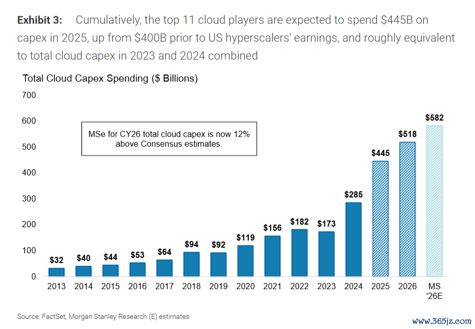 摩根士丹利最新研报大幅上调了对好意思国四大云管事提供商——亚马逊、谷歌、Meta和微软的老本开支预测。这四家公司在2025年的并吞老本开支瞻望将达到3590亿好意思元,同比增长57%;2026年将进一步增至4540亿好意思元,同比增长26%,均权臣高于此前的预测。